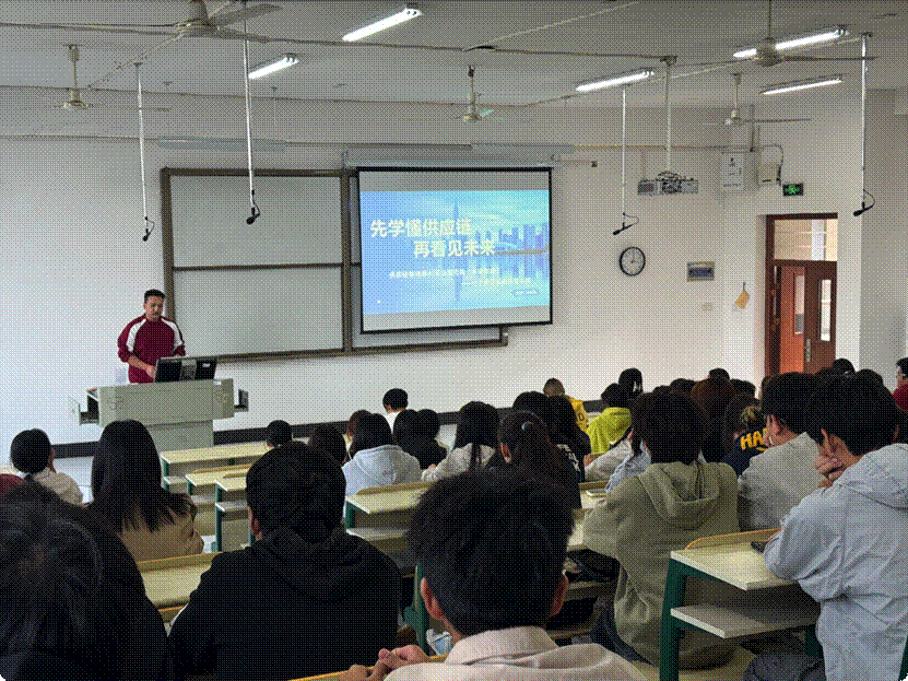 近日,我校2022级供应链管理专业优秀学生杨绍焕在“先学懂供应链,再看见未来”主题分享会上,为2025级新生带来了一场生动深刻的专业启蒙。供应链管理系主任张昭、专业负责人范瑾、专任教师罗岚及全体新生共同参与,师生共话专业发展与成长路径。