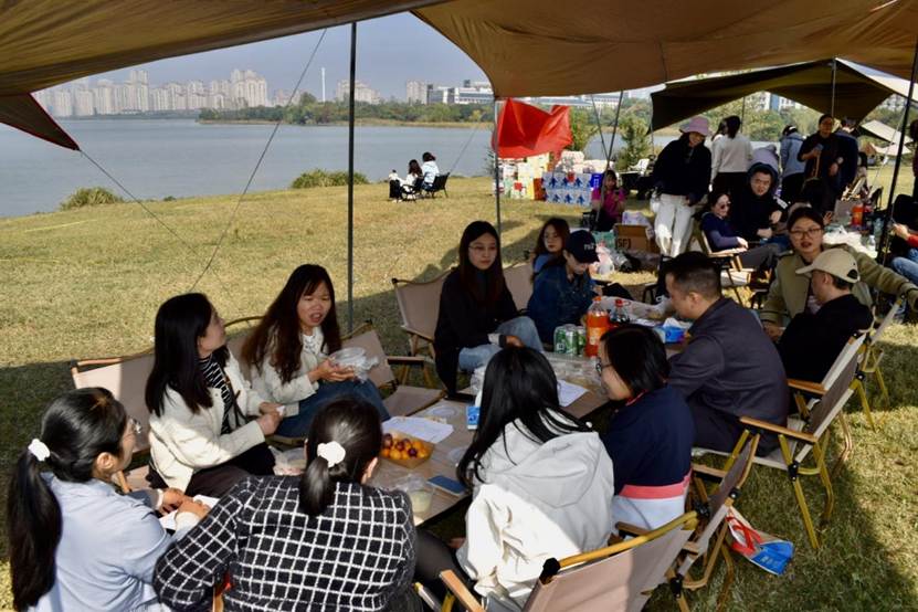 活动现场氛围热烈而温馨。大家围坐在一起,畅谈工作与生活。从课堂教学的心得交流到校园发展的热烈探讨,从家庭趣事的温馨分享到未来规划的真诚沟通。各系借着这轻松的氛围,在湖畔草地上开起了“组会”,研讨布置工作。欢声笑语萦绕在草坪上空,暖意与幸福感在彼此间传递。