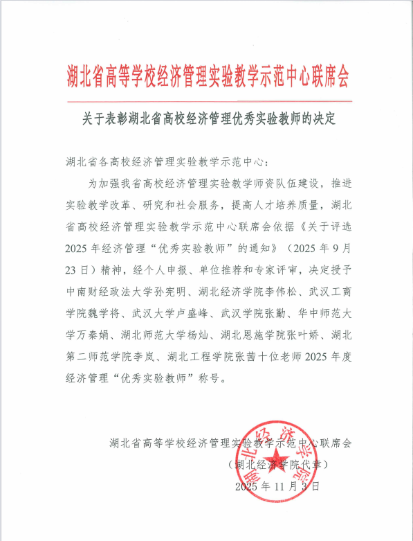 11月15日,湖北省高校经济管理实验教学示范中心联席会发布了湖北省高校经济管理实验教学优秀教师获奖名单,管理学院张勤副教授获评“2025年度湖北省高校经济管理实验教学优秀教师”荣誉。