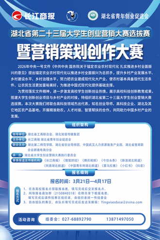 为助力大学生创新创业与乡村振兴,提升青年营销实践能力,湖北省第二十三届创业营销大赛暨营销策划创作大赛正式启动。