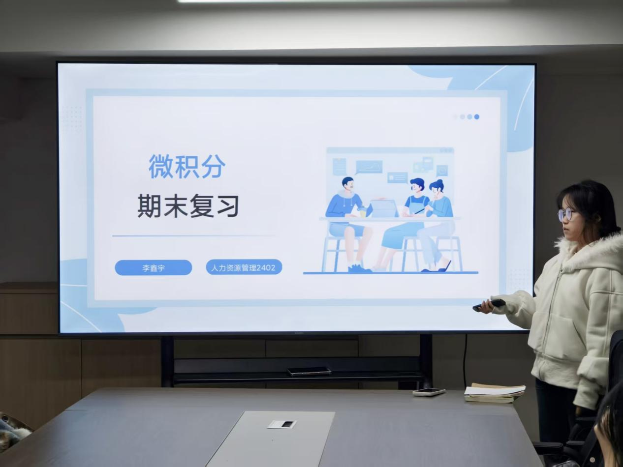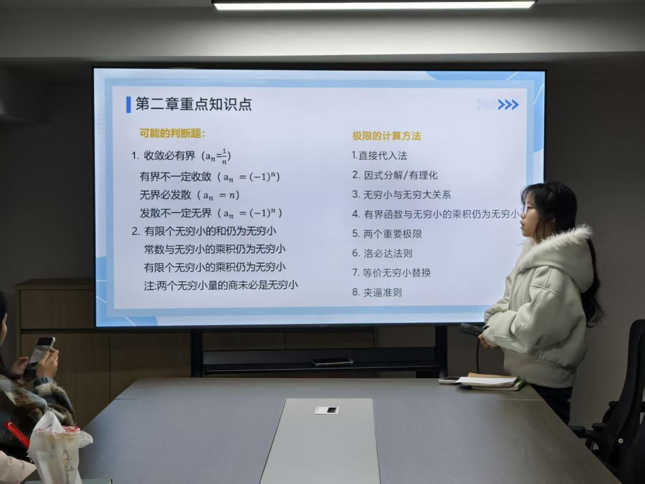 本次活动特邀人力资源管理2402 班李鑫宇担任学业辅导小老师。她围绕得分逻辑梳理与题型破解避坑两大核心展开辅导:在得分逻辑上,明确考点分层与解题优先级,串联函数概念、极限与连续、导数与微分等核心知识,梳理公式及变形技巧,帮助同学们建立 “先化简 - 再运算 - 后验证” 的标准化解题流程;针对极限计算、隐函数求导等高频题型,分享快速解题方法,并重点提醒换元积分忘记换限等常见失分陷阱,助力同学们高效备考、稳步提分。