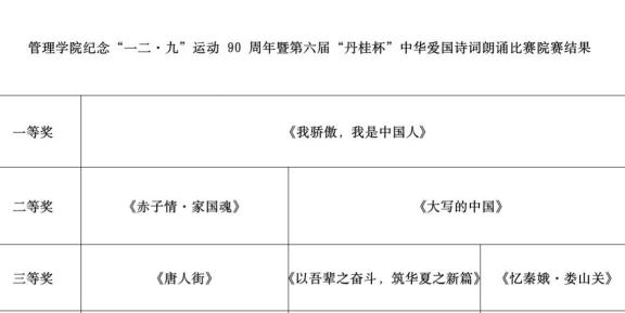 近日,党委宣传部举办的纪念“一二·九”运动90周年暨第六届“丹桂杯”中华爱国诗词朗诵比赛总决赛圆满落幕。我院报送的作品《我骄傲,我中国人》获得一等奖,管理学院获“优秀组织奖”。